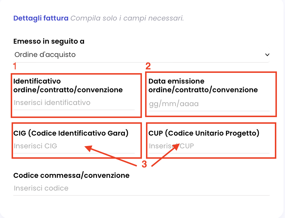 - Compila i campi necessari, forniti dal tuo cliente. Obbligatori campi 1 e 2 come da immagini e poi o CIG o CUP o entrambi a seconda del/dei codici forniti.